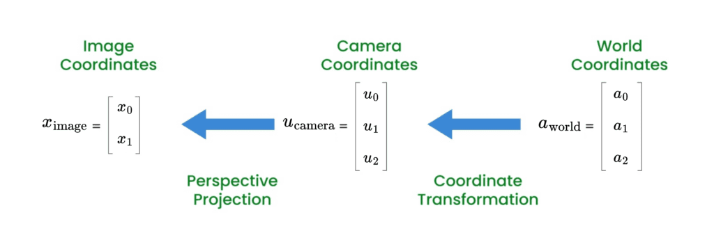 $$ u_{\text{camera}} = E_{\text{world}}^{\text{camera}} \, a_{\text{world}} = R a_{\text{world}} + T $$2. 相机投影(Camera Projection)